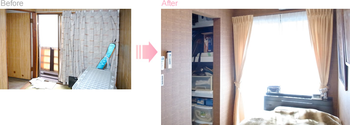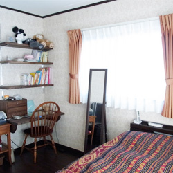 以前、お母様がピアノ教室に使われていた部屋を、O様憧れの書斎にしました。お祖父様が使われていた机を置いて、その前には作りつけの棚を設けて音響機器を納めました。休みの日には好きな音楽を聴いたり、トランペットを演奏したりしています。